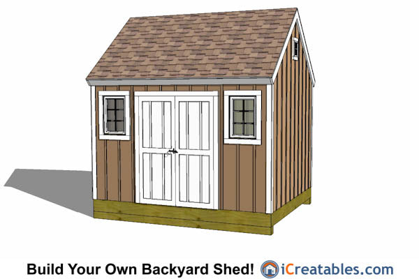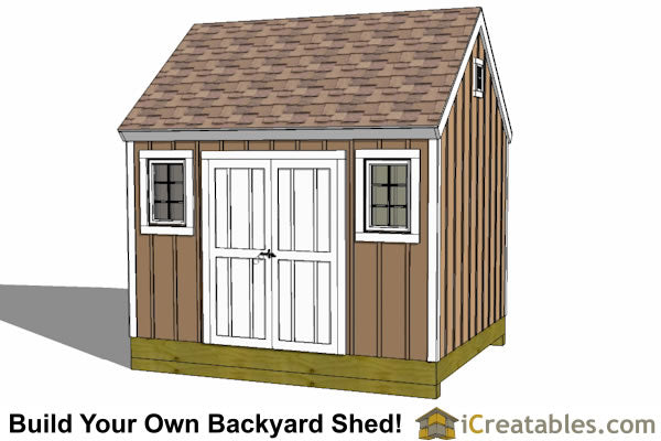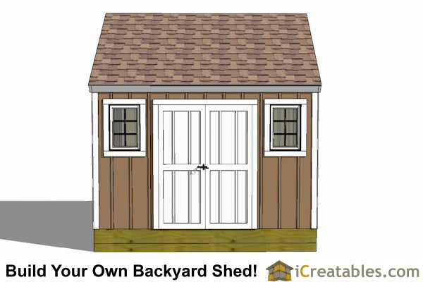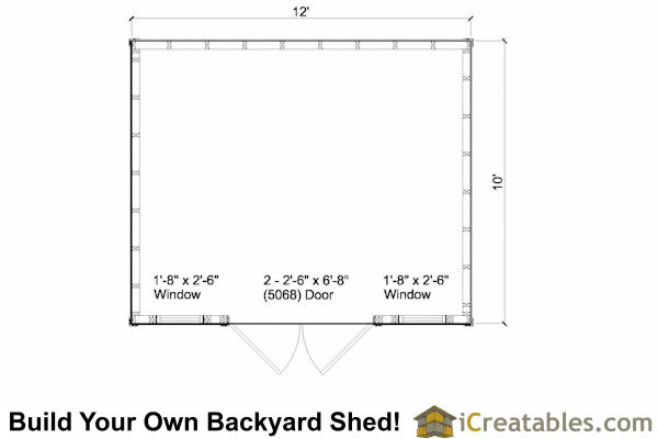 Door = The storage shed plans are designed to have double doors measuring 5'-0" x 6'-8". Purchase and install factory built pre-hung doors or build the doors using the included shed door plans.