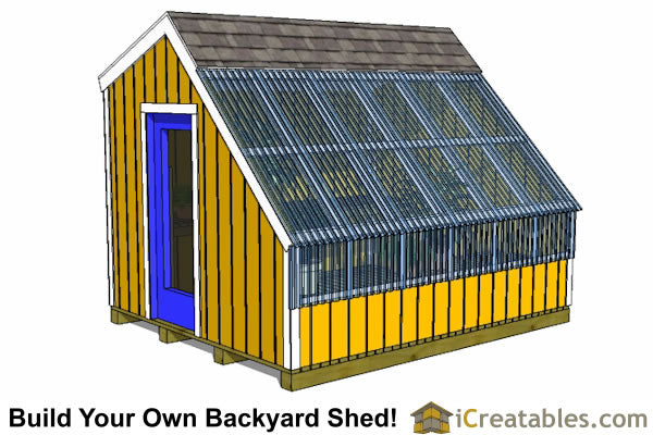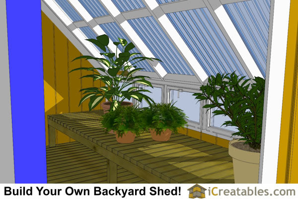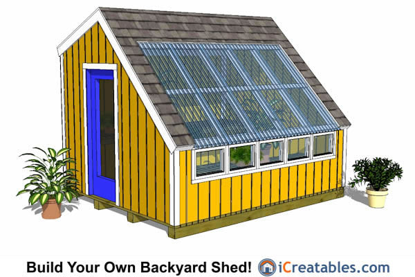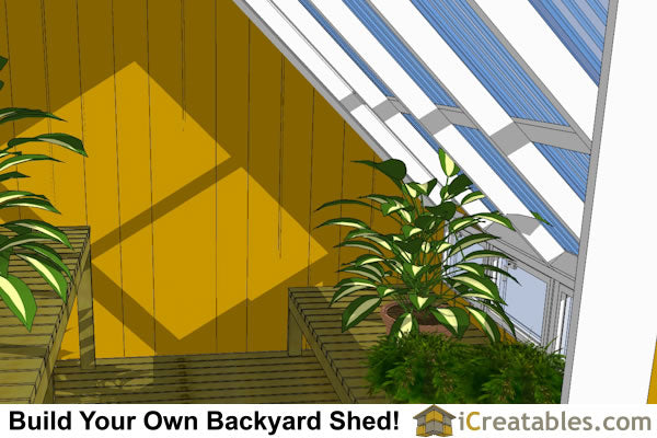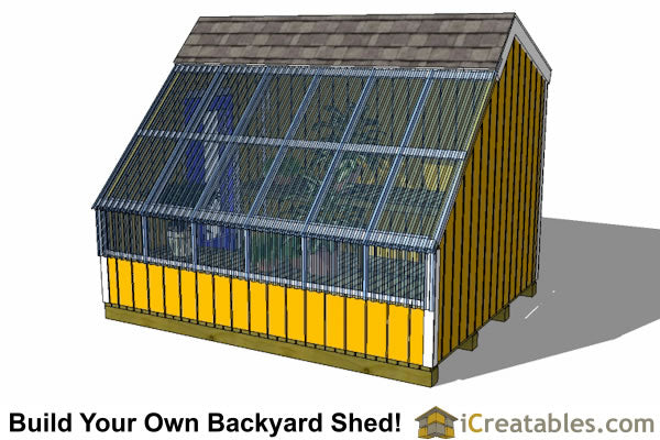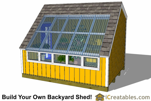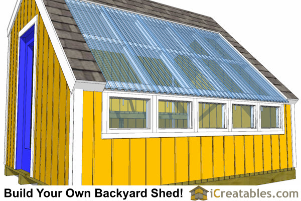 Options: Plans include options to install greenhouse windows on the wall under the polycarbonate roofing.