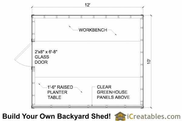 Door: The 10x12 greenhouse shed uses a standard house door which is typically a door with glass in it.