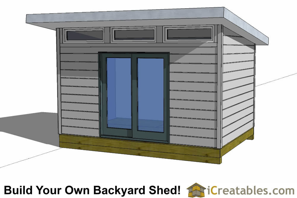 An 10x14 shed designed to be used as a office or workspace. The difference between modern and other storage sheds is mostly the design of the roof and the addition of windows to add light. The usable storage space inside is the same it is simply the look that is different. The flat roof is a little simpler to build and there are additional windows. The modern shed also is designed to use a regular residential home door. The modern shed can be built without windows. Our storage shed plans use a 8 1/2 x 11" page format so you can easily print them out on your home printer. All pages of the plans have dimensions on every part.