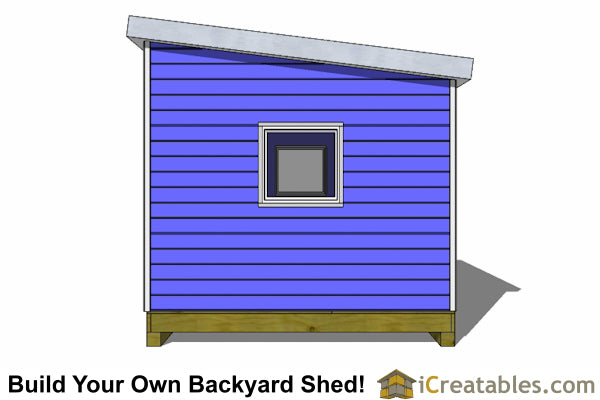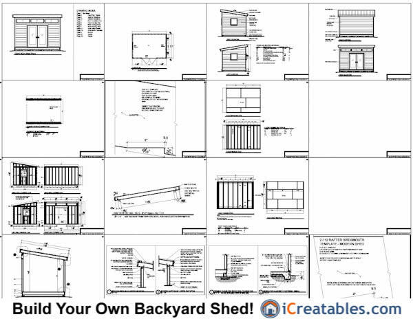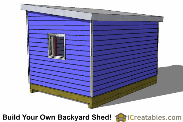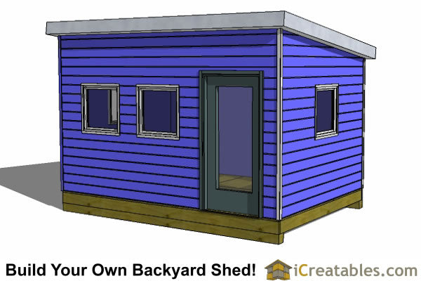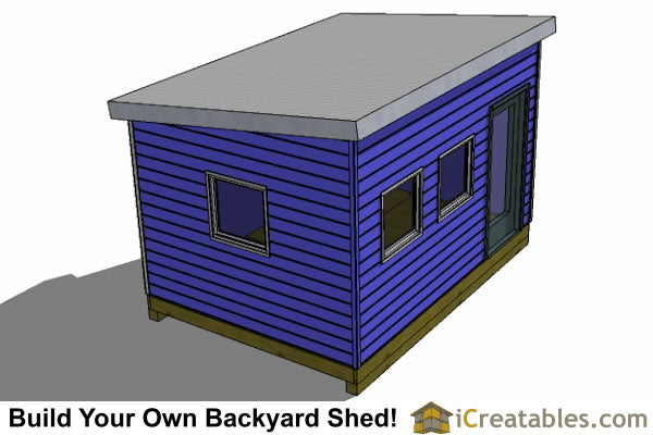Walls: 2x4 framing at 16" on center with a double top plate and the lower shedwall height is 7'-6" the taller wall is 9'-2 1/2". The walls are sheeted with 7/16" O.S.B. which will hold any siding you wish to put on your modern shed.