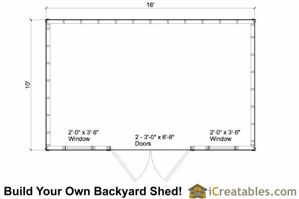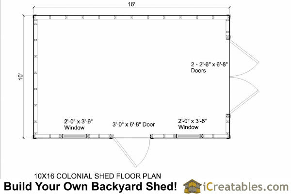 Alternate Options: The 10x16 Colonial shed plans can be built with either factory built doors or you can build the doors using the door plans included with the shed plans. You may also remove the double doors and install another window.