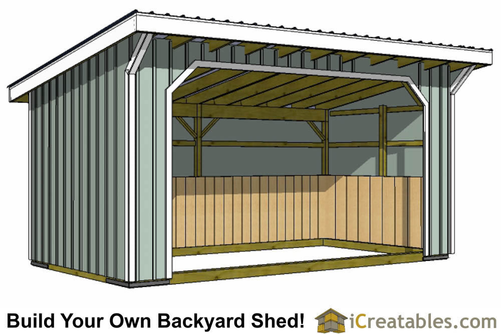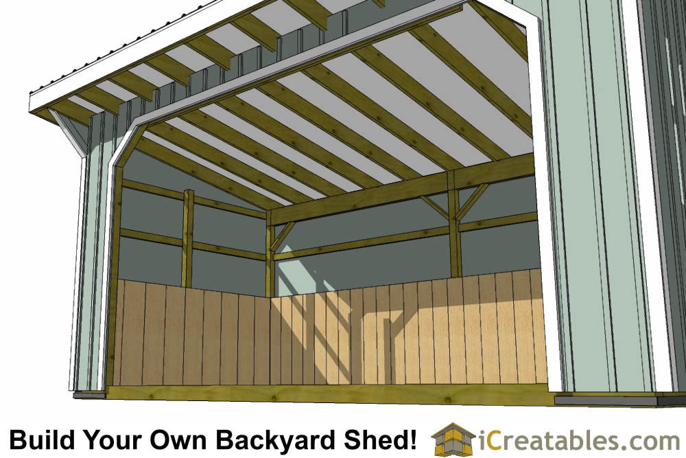 - Walls Framing: 4x4 posts with 2x4 girt boards and kick panels on the inside.