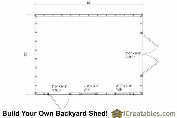 - Door: The end double utility door is 6' wide and 6'-8" tall. The front door is 3' x 6'-8" tall. The plans come with plans for home made doors or you can purchase pre-hung doors.