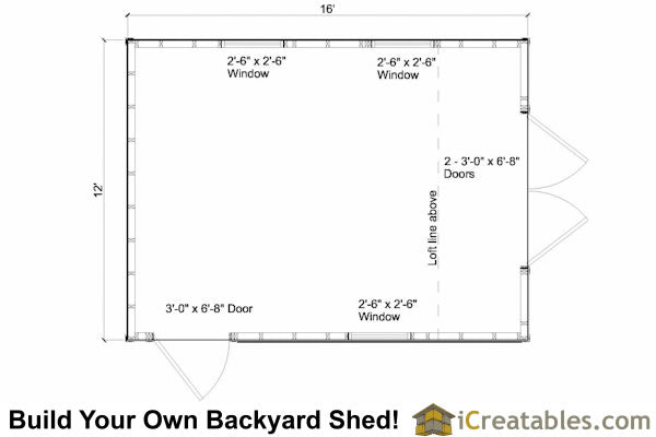 - Doors: The 12x16 shed has 2 doors, the double doors make a 6'-0" x 6'-8" opening. You can either build the doors using the included door plans or purchase factory built pre-hung doors.